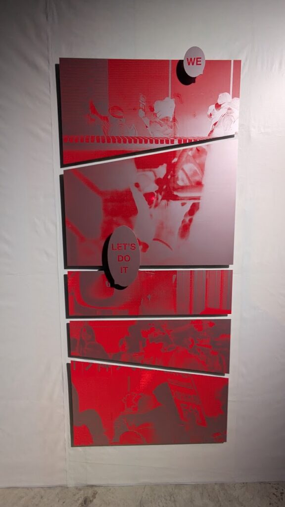 アテネ出身のアントニス・ビッタスは「歴史のリサイクル」をテーマに、現代社会の問題を作品化するアーティスト。 バウハウスやロシア構成主義などのモダニズムの視覚言語を用い、歴史を独自に解釈する。ユートピア的な願望 が容易に反転し、破壊や権力の肯定につながるという考えに基づき、歴史と現代を結びつける。《Nobody is Un- related》は、日本でのリサーチを元に、反射シートへのシルクスクリーン印刷で制作されており、移民問題のデモ行進が漫画のコマのように表されており、コミカルに現実とファンタジーが交錯する日常を映す。