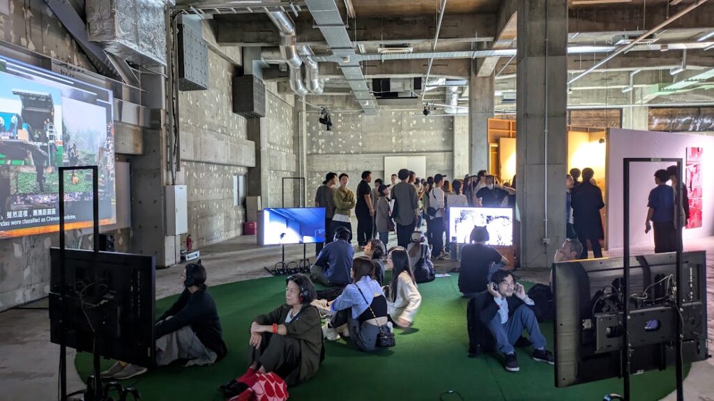 芝生のような緑のサークルには自由に座って映像作品を鑑賞できます。