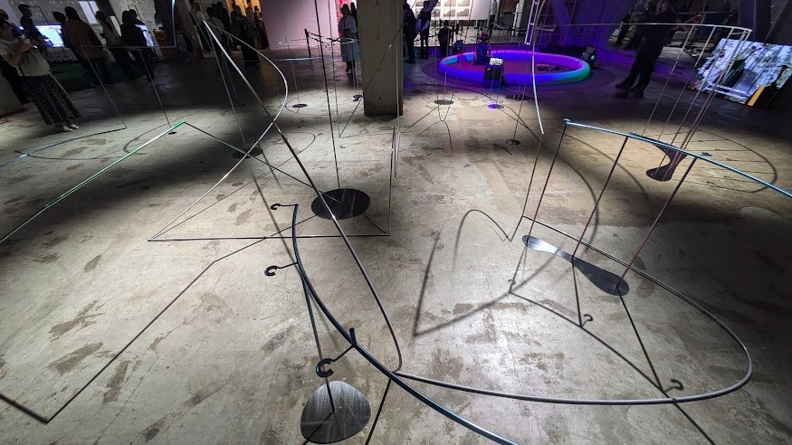 床に置かれたスチールバー。空間に曲線を描いたようなデザインが特徴的です。