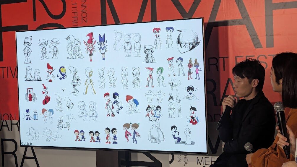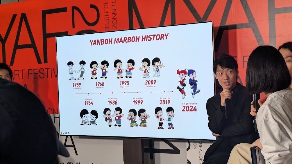 名物キャラクターであるヤンボーマーボーの変化の歴史。右でお話しているのが、ヤンマーデザイナーの印田千容さん。