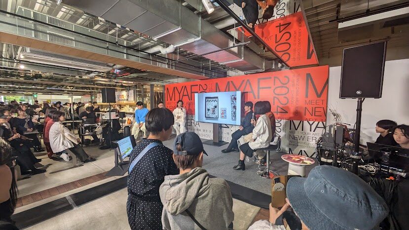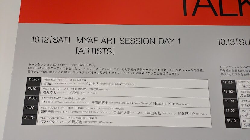 トークテーマは、会場内で開催中の「ヤン坊マー坊 ART EXHIBITION in MYAF2024」について。